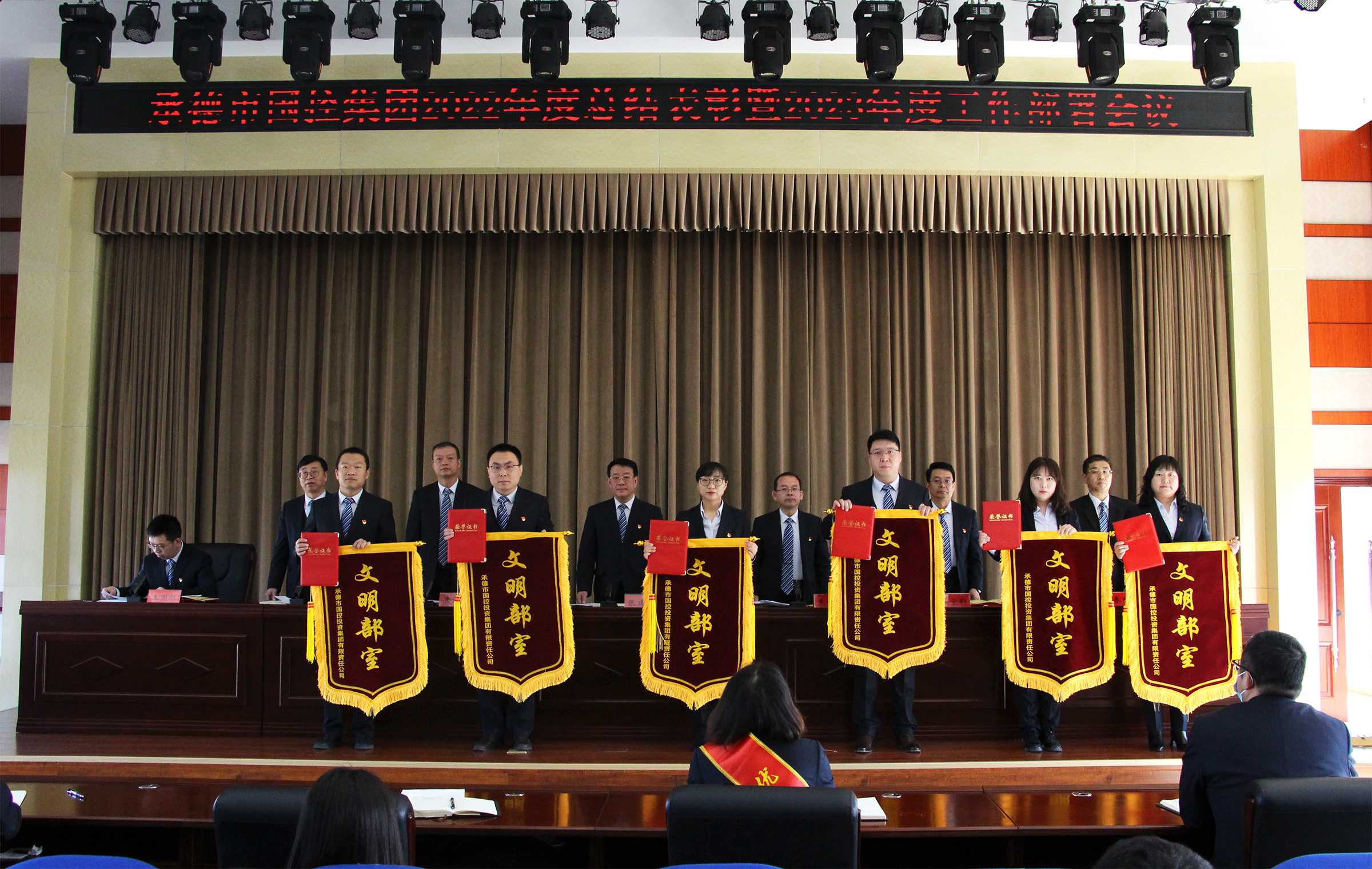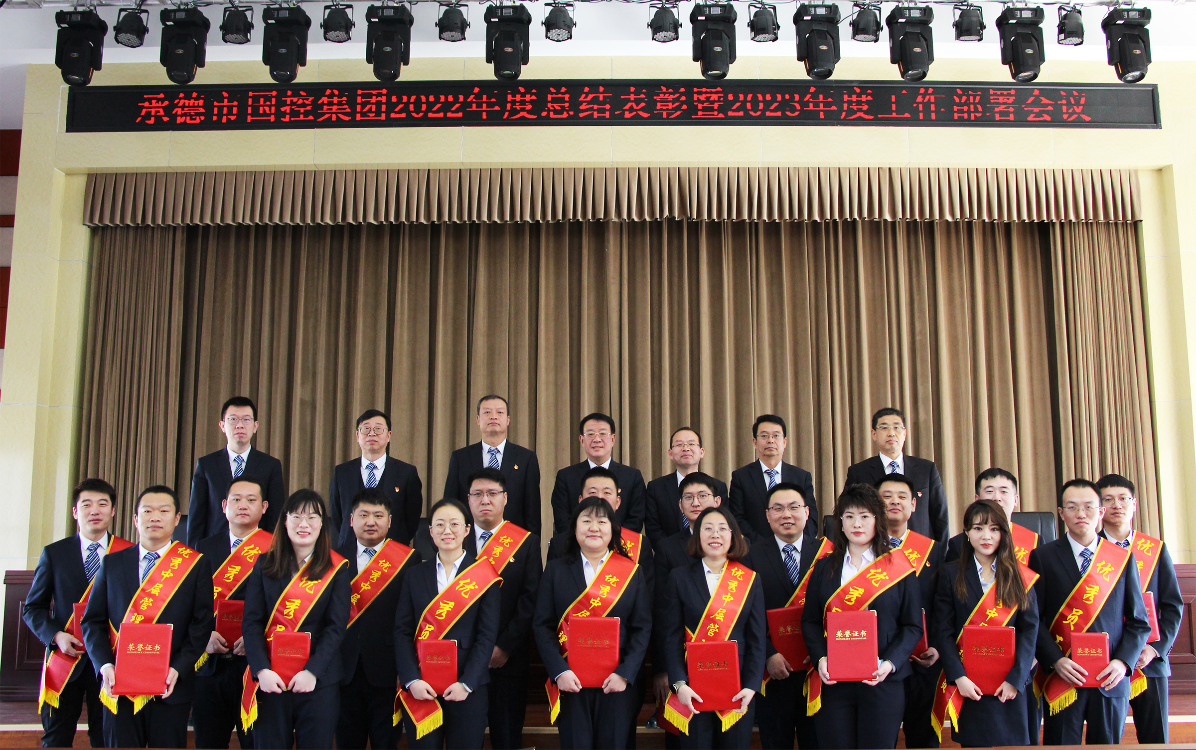 会议宣读了集团公司2022年度受表彰情况,通报了获得年度优秀的部室、子公司、中层管理人员及员工,与会领导向获奖集体和个人颁发了锦旗、荣誉证书。按照2023年度工作部署要求,党委书记、董事长张建军代表集团公司逐一与集团公司各部室及实际控制子公司签订了《2023年度绩效考核目标责任书》,坚持目标导向,强化责任,传导压力。
