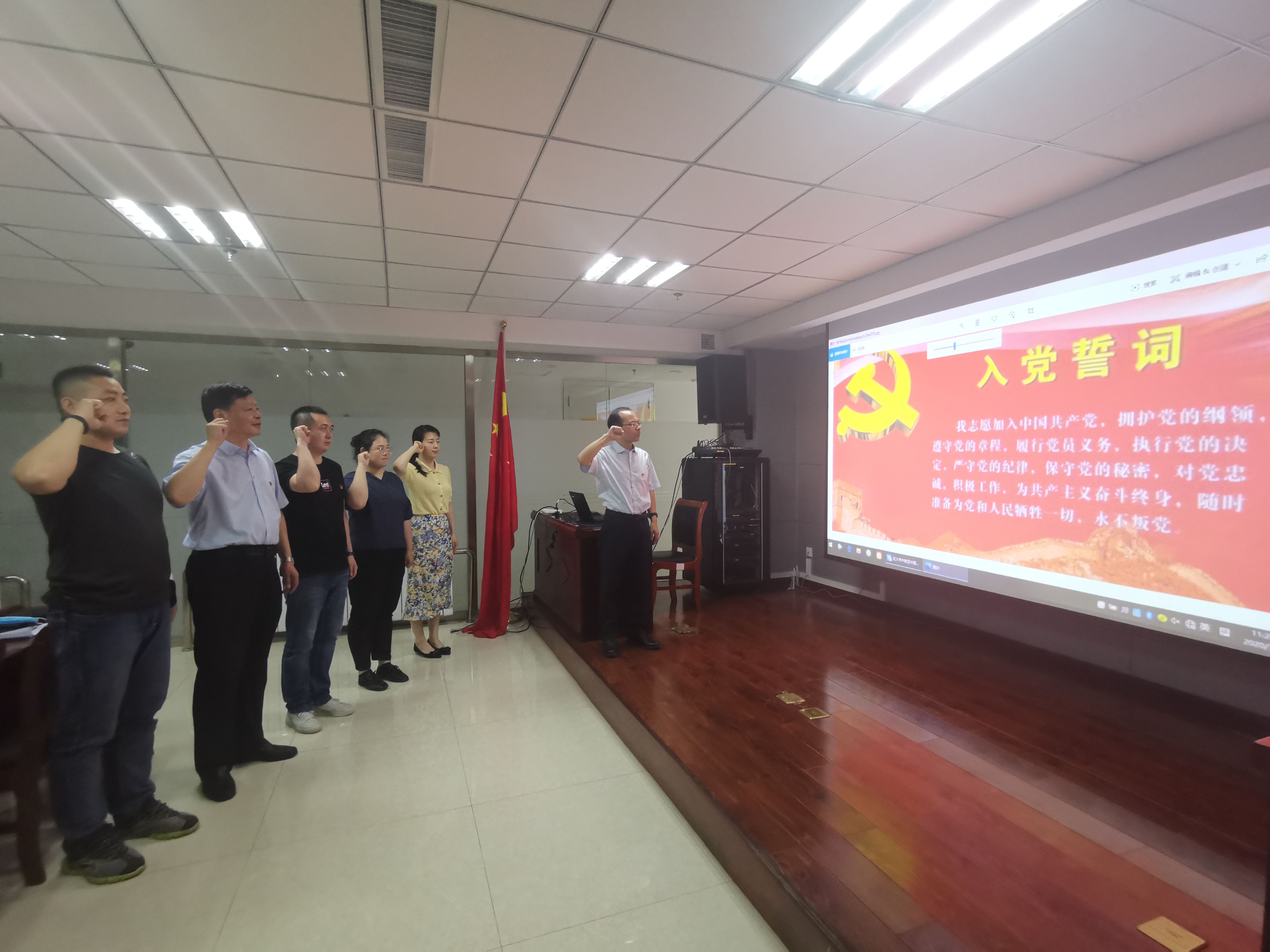 由党支部书记焦俊良同志领誓,全体党员面对鲜红的党旗,举起右拳,庄严宣誓。“我宣誓:我志愿加入中国共产党,拥护党的纲领,遵守党的章程,履行党员义务,执行党的决定,严守党的纪律,保守党的秘密,对党忠诚,积极工作,为共产主义奋斗终身,随时准备为党和人民牺牲一切,永不叛党。”铿锵有力的誓言,让每名党员受到了一次深刻的党性教育和政治灵魂洗礼。
