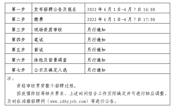 2022年6月1日至2022年6月7日16:00 在鸿雅招聘网(http://www.cdhyjob.com/)、鸿雅微信公众号、开云电子体育官方网站(/)及上级部门要求的相关网站等发布招聘公告。